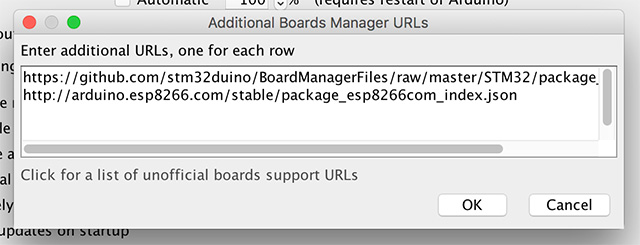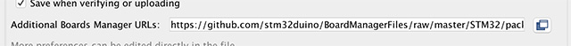 Aggiungete all’interno del campo “Additional Boards Manager URLs” l’URL corrispondente ai pacchetti per l’stm32duino
