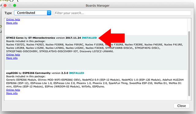 Al termine dell’installazione comparirà a fianco del pacchetto STM32 la voce: INSTALLED