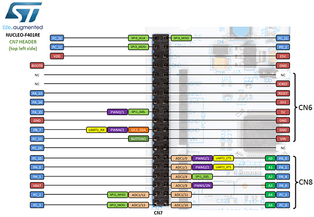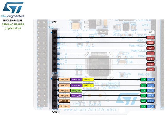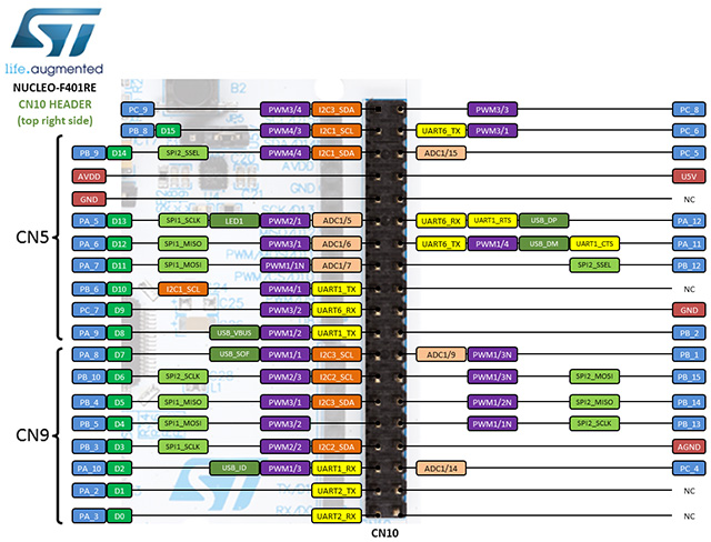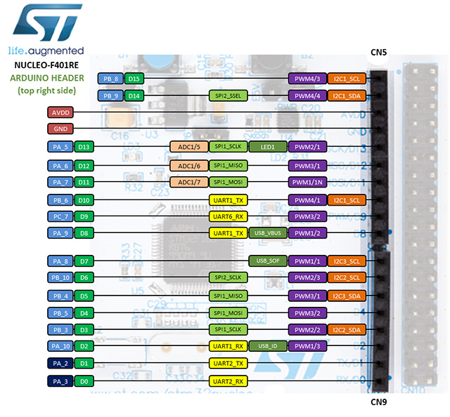 Il Microcontrollori è costituito da connettori compatibili con la piedinatura dell’Arduino UNO R3 e connettori per le schede ST chiamate Morpho da cui potete accedere a tutti i pin del microcontrollore.