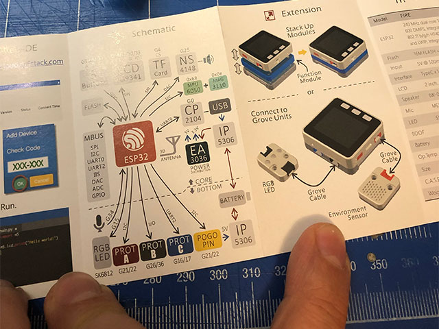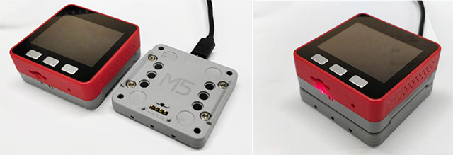 M5Stack Fire è costituito da tre unità separabili. Nell’unità superiore è alloggia tutta l’elettronica principale, l’ESP32, l’antenna 2.4G, l’elettronica per la gestione dell’alimentazione, schermo LCD touch. La parte centrale è chiamata base M5GO, all’interno trova posto una batteria al litio, una presa M-BUS, due strisce LED RGB e altre due porte GROVE. La parte inferiore è adibita alla ricarica, può essere collegata alla base M5GO tramite pin POGO. All’interno dell’M5Stack si trova anche una IMU in grado di fornire la posizione nello spazio del dispositivo.