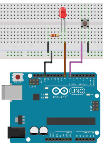 Nel caso abbiate la necessità di invertire lo stato e fare in modo che il LED sia normalmente spento e si accenda alla pressione del pulsante sarà sufficiente applicare l’operatore NOT, indicato con il simbolo “!”  alla funzione digitalRead(7):