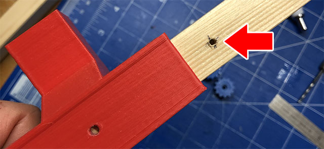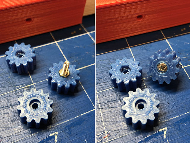 Nell’immagine che segue è mostrato come realizzare i pomelli che utilizzerete anche in altre parti. Inserite il dado nella sede esagonale del pomello ed avvitate con vite da 16 mm: