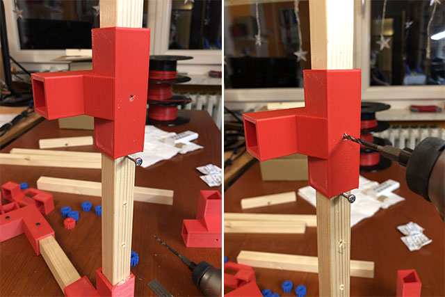Al primo giunto a T fissare con vite da 16 mm il montante verticale da 50 cm. La vite è inserita all’interno di un pomello. Per favorire l’invito della vite praticare un piccolo for da 3 mm di diametro.