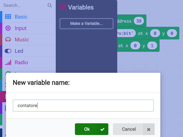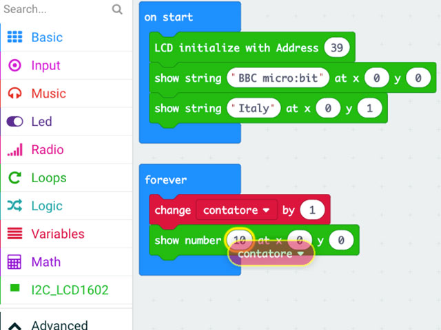 Con l’istruzione “show number” visualizziamo sul display un numero, inserendo nel primo campo la variabile “contatore” il numero visualizzato sarà quello memorizzato nella variabile contatore:
