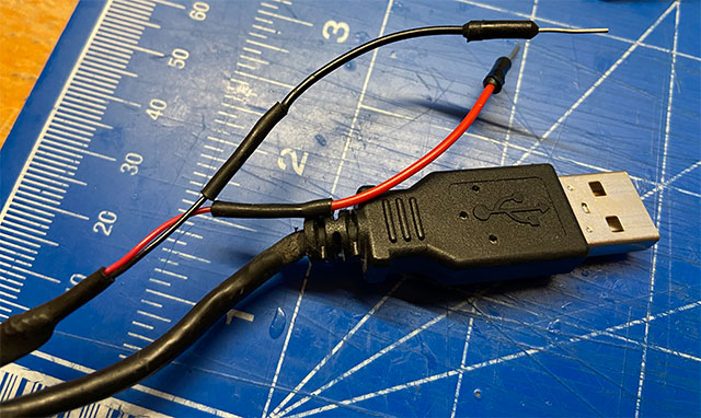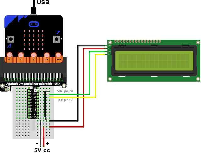 Sul micro:bit il pin 20 corrisponde all’SDA e il pin 19 all’SCL, pin che avranno una corrispondenza con il display. Per le mie sperimentazioni dispongo di un cavo USB modificato per poter inserire su breadboard la tensione di 5V proveniente dalla USB del computer.