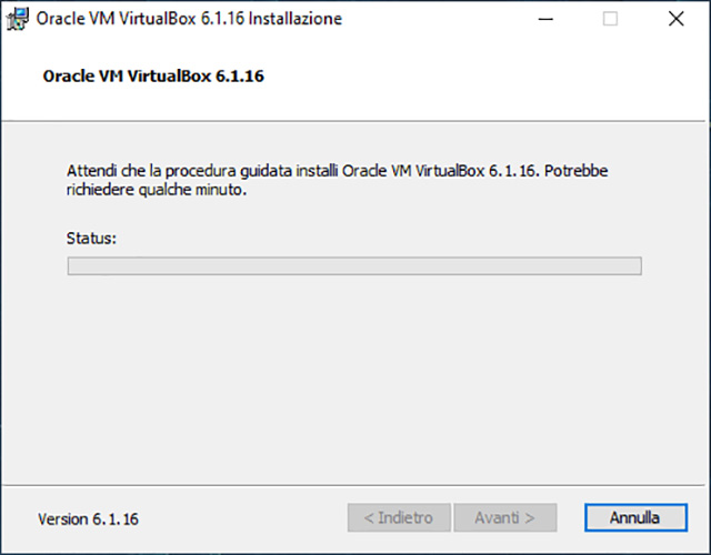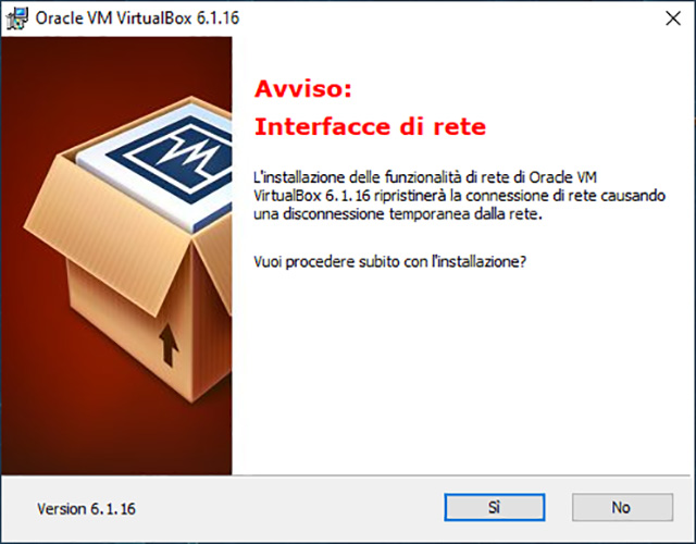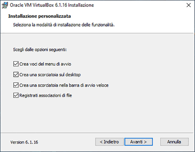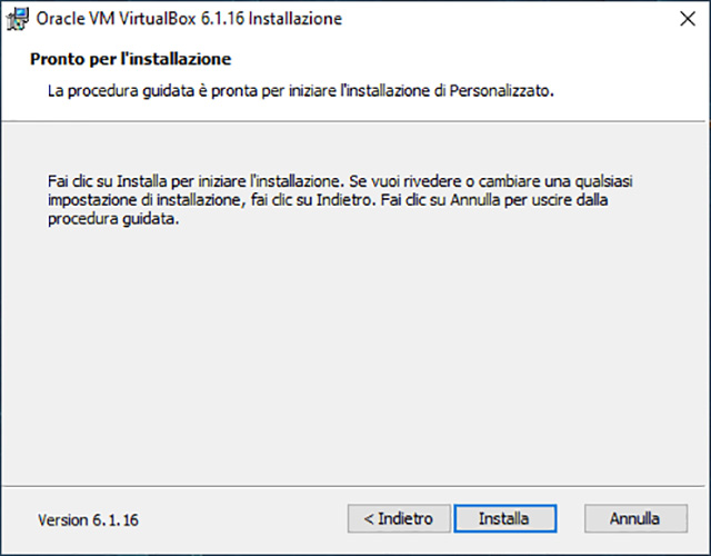Nella cartella di download ritroverete l’installatore di VirtualBox, avviate l’installazione e seguite passo passo le fasi installazione. Le immagini che seguono mostrano esattamente la sequenza delle finestre mostrate in fase di installazione: