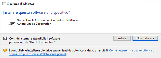 L’installazione necessita dell’installazione di un controller USB aggiuntivo in modo che le periferiche USB fisiche del vostro computer possano essere usate dal sistema virtualizzato, clic su “Installa”