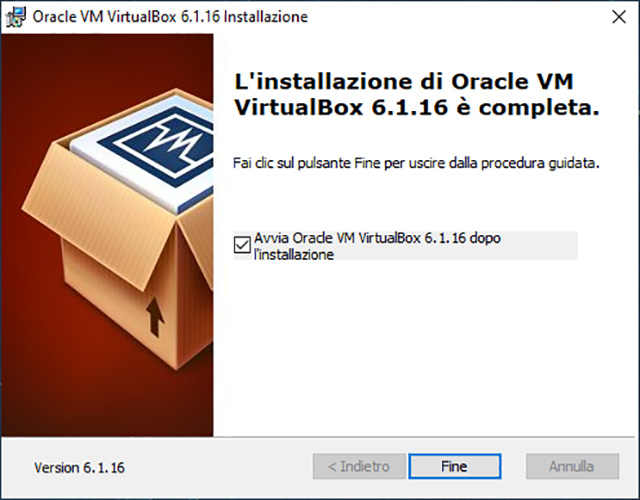 Al termine dell’installazione, se la spunta è selezionata, il click sul pulsante “Fine” provocherà l’avvio di VirtualBox