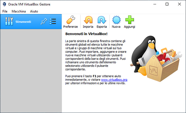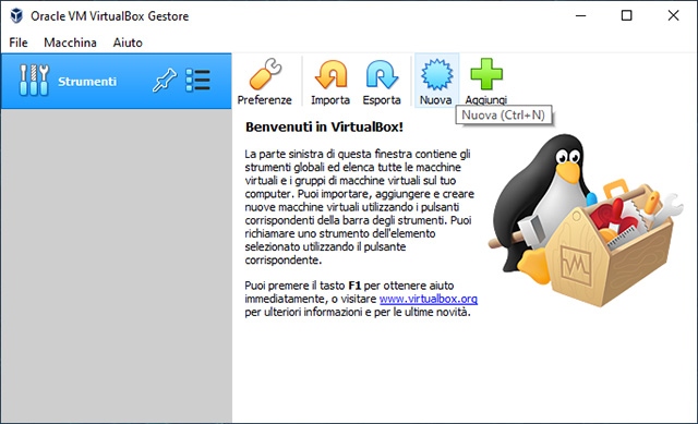 Sulla sinistra della finestra sarà mostrato l’elenco di tutte le macchine virtuali che andrete ad installare, ovviamente in una prima installazione l’elenco sarà vuoto.
