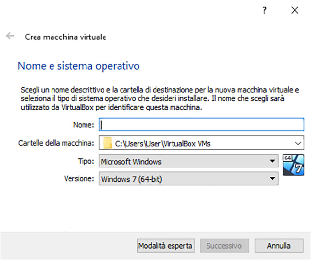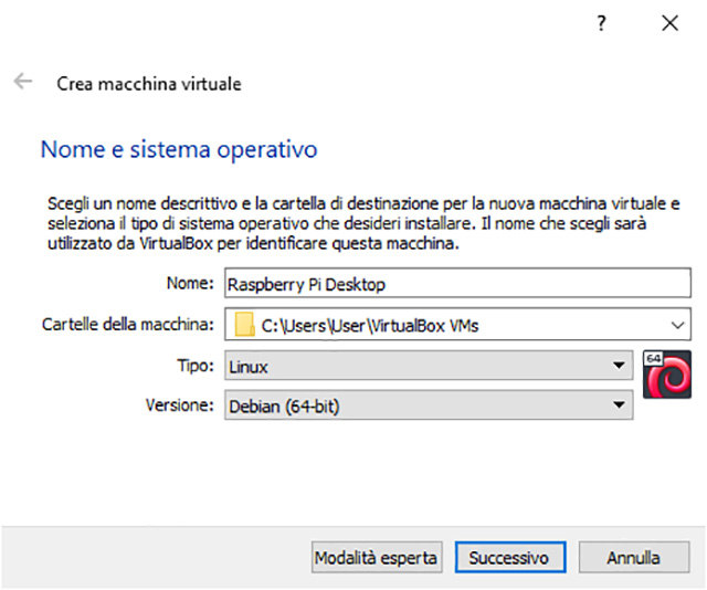 Assegnare un “Nome” alla macchina virtuale, nel mio caso: “Raspberry Pi Desktop”, una “Cartella della macchina” che potete lasciare quella di default