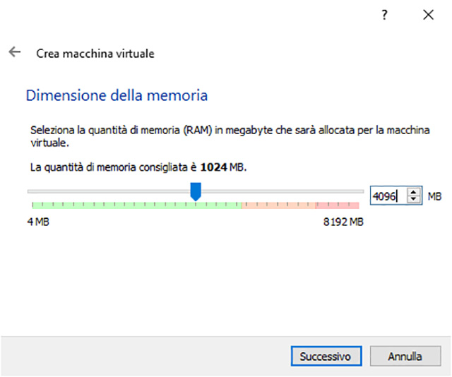 Allocazione della memoria RAM, la dimensione consigliata è di 1024 MB, ma per avere prestazioni migliori assegno 4096 MB, l’importante è che rimaniate all’interno della fascia verde in in questo modo non verranno tolte troppe risorse al computer host (che ospita il sistema virtuale)