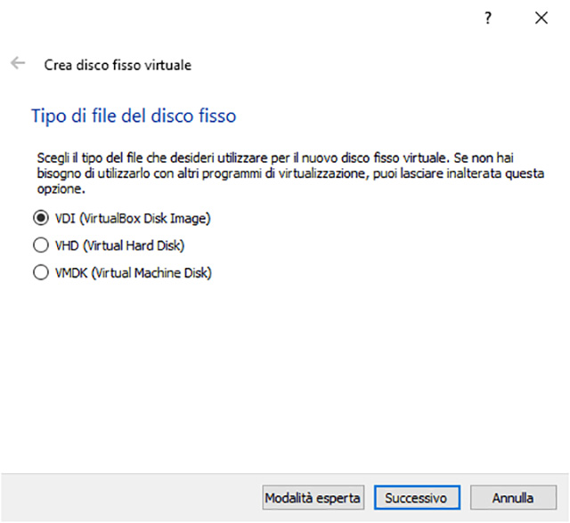 VirtualBox vi chiederà il tipo di disco rigido virtuale, vi consiglio di selezionare “VDI (VirtualBox Disk Image)”, opzione predefinita. Clic su “Successivo”.