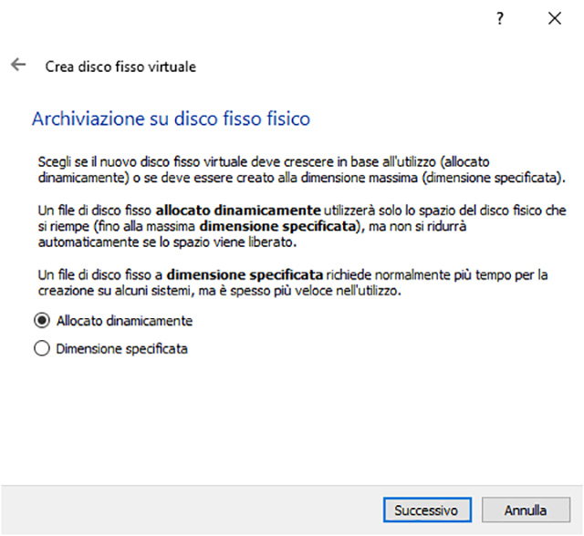 Verrà richiesto di selezionare tra disco: “Allocato dinamicamente” o “Dimensione specificata”. Se avete spazio disco e computer sufficientemente potente vi consiglio l’impostazione: “Allocato dinamicamente”, se avete un computer host con prestazioni non elevate e poco spazio disco il consiglio è: “Dimensione specificata”.