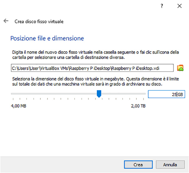 L’impostazione predefinita di 8 GB è piuttosto basso il consiglio, se potete farlo sul vostro computer, è quello di aumentarlo ad almeno 15/25 GB. Ovviamente questa dimensione sarà da impostare anche in funzione di ciò che dovrete sperimentare, se il sistema virtualizzato dovrà ospitare ad esempio file multimediali di grandi dimensioni allora dovrete aumentare  le dimensioni.