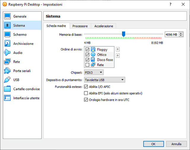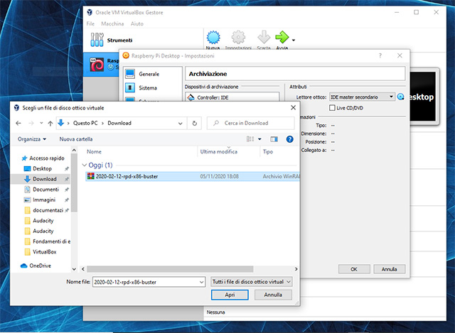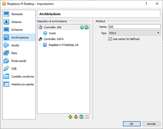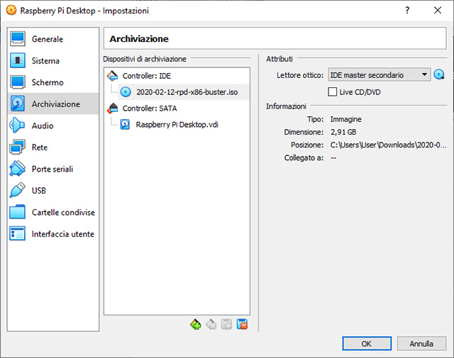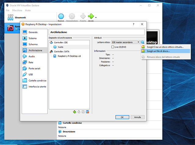 Bisogna associa il file ISO di Raspberry Pi Desktop alla vostra macchina virtuale. Sempre dalle impostazioni andate nella scheda “Archiviazione”.