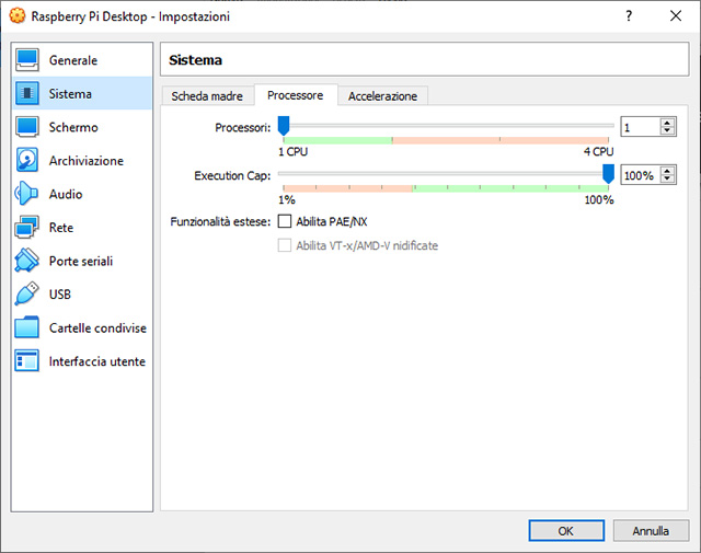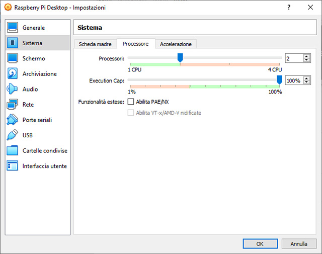 Se il vostro computer fisico è dotato di 4 o 8 core, vi consiglio di usare da 2 a 4 core. Ciò velocizzerà parecchio la vostra macchina virtuale. L’impostazione da me scelta è di 2 core.