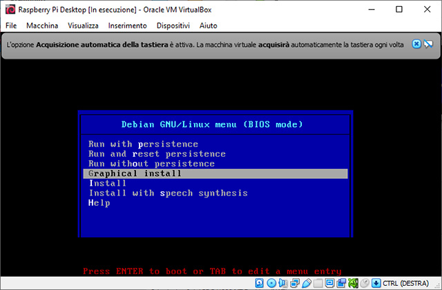 Al primo avvio di Raspberry Pi Desktop da VirtualBox, verrà visualizzato un menu che vi chiederà tra l’esecuzione o l’installazione del sistema operativo. Selezionate “Graphical install” spostandovi con i tasti freccia della tastiera e premendo successivamente invio.