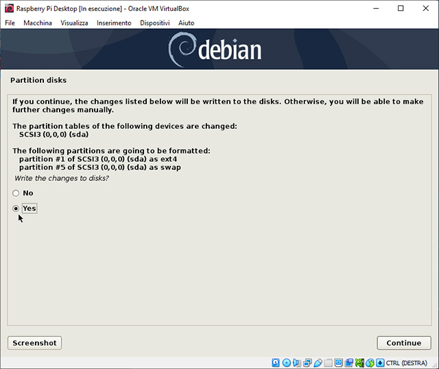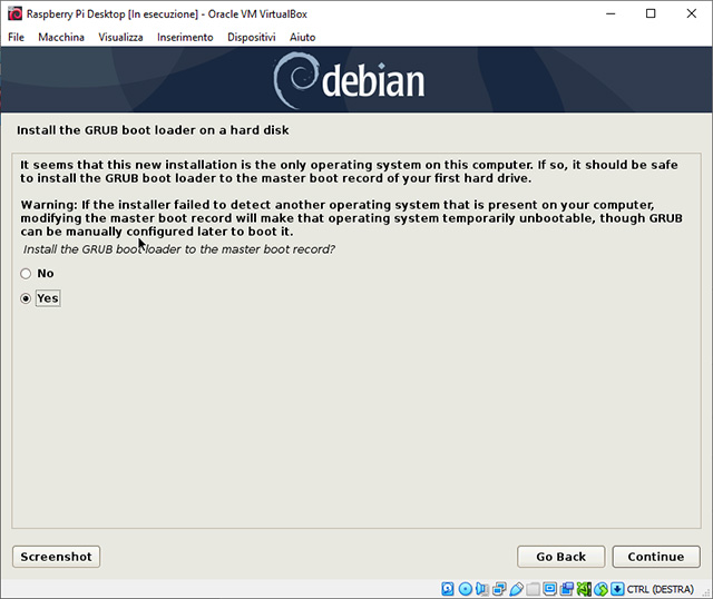 Dopo aver partizionato il disco, la procedura guidata di installazione vi chiederà se desideri installare sul disco rigido appena creato il boot loader GRUB. Procedete in questo modo, scegliete “Sì” e poi fate clic su “Continue”.