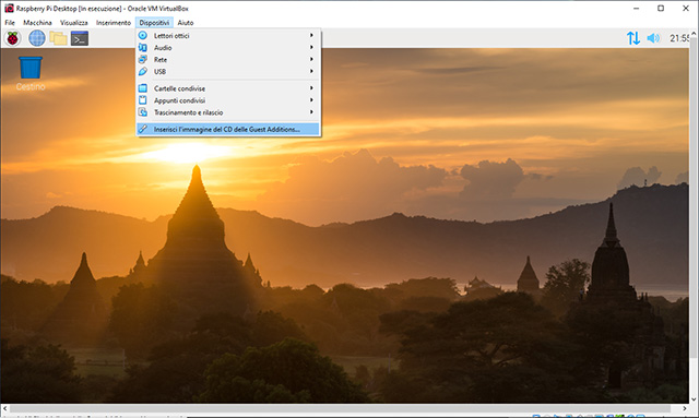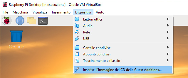 Dispositivi > Inserisci l’immagine del CD delle VirtualBox guest addition
