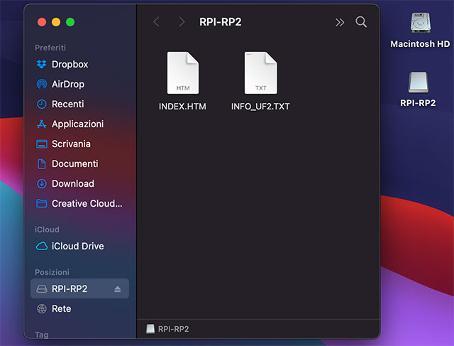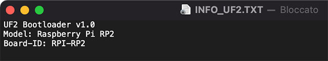 Nella finestra del vostro File Manager, vedrete due file sul Pico: INDEX.HTM e INFO_UF2.TXT. Il file INFO_UF2.TXT contiene informazioni sul Pico tra cui la versione del bootloader attualmente in esecuzione sul Pico.