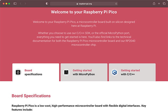 Il file, INDEX.HTM, contiene tutte le informazioni utili per usare il Pico, fate doppio clic, sarete reindirizzati sulla pagina di benvenuto da cui reperire tutte le informazioni che servono per iniziare. Fate clic sulle schede scorrete la pagina per accedere alle guide, ai progetti e alla raccolta di libri: una libreria di documentazione tecnica dettagliata che copre tutto, dal funzionamento interno del microcontrollore RP2040 il cuore della vostra scheda, alla programmazione in Python e C / C ++.