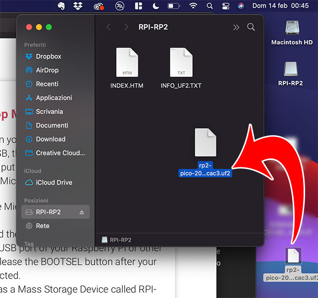 Una volta scaricato, andate nella vostra cartella Download cercate il file “micropython” seguito da una data e dall’estensione “uf2”. Fare clic e tenere premuto il pulsante del mouse sul file UF2, quindi trascinatelo sull’unità di archiviazione rimovibile di Pico (quindi all’interno del Pico). Posizionalo sulla finestra e rilascia il pulsante del mouse per rilasciare il file sul vostro Pico.