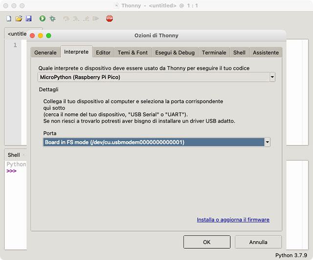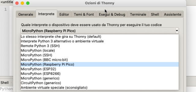 Configuriamo ora l’IDE per poter programmare il Pico, dal menù > Strumenti > Opzioni… selezionare “Interprete”