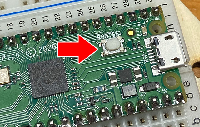 Il Pico include un connettore micro USB, che permette un collegamento seriale UART-over-USB al microcontrollore RP2040 per la programmazione e l’interazione e che alimenta il chip. Tenendo premuto il pulsante BOOTSEL quando si collega il cavo, il microcontrollore passerà alla modalità “Dispositivo di archiviazione di massa USB”, consentendo di caricare il nuovo firmware.