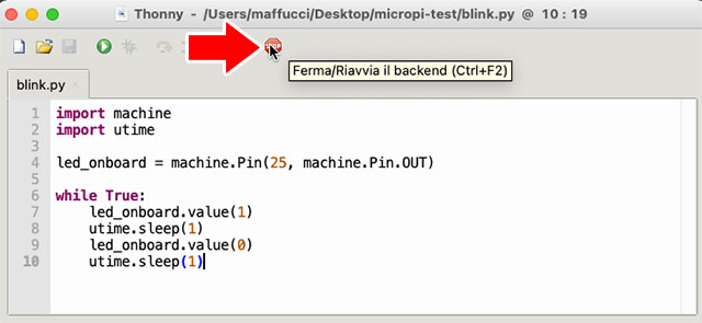Come si può notare la funzione machine.Pin() è costituita da due parametri: il pin a cui è connesso il LED, il 25, seguito dalla modalità con cui viene usato il pin, OUT. Per chi ha familiarità con la programmazione con Arduino noterà che l’azione è la medesima, cambia solo la sintassi.