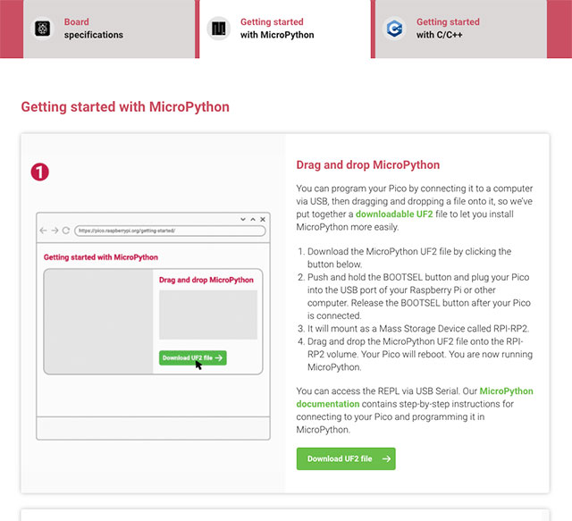 Leggete tutte le informazioni sulla pagina, andate in “Getting started with MicroPython” e fate clic sul pulsante “Scarica file UF2” per scaricare il firmware MicroPython, che è un piccolo file che contiene MicroPython per il vostro Pico. Il download dal sito di riferimento richiede pochissimi secondi.