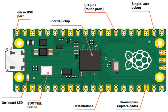 L’RP2040 è il primo microcontrollore di Raspberry Pi. I due core del processore Cortex-M0+ del Pico funzionano a 48 MHz, anche se questo può essere modificato nel software fino a 133 MHz.