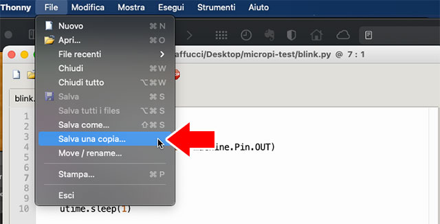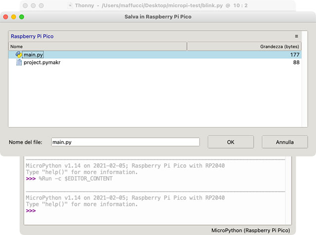 Nel caso in cui invece desiderate rendere l’esecuzione automatica non appena il Pico viene connesso ad una fonte di alimentazione, rinominate il file in main.py e salvatelo sulla scheda