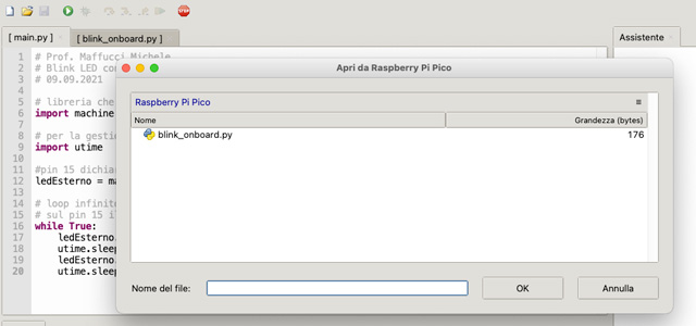 Per poter consultare la lista di file memorizzati all’interno del microcontrollore con l’IDE Thonny, fate clic su “Apri” (seconda icona)
