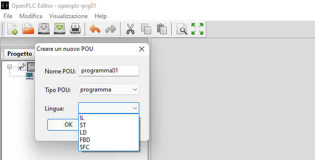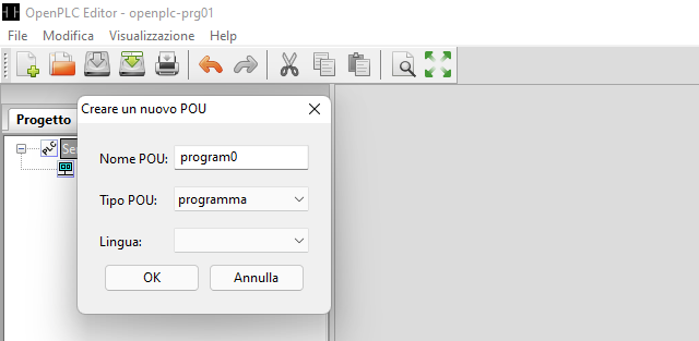 Verrà mostrata inoltre una nuova finestra in cui verrà chiesto di creare un nuovo POU (Program Organization Unit). Il POU viene utilizzato per memorizzare tutto il codice che andrete a scrivere nel progetto. Una volta selezionata la posizione, OpenPLC Editor creerà il progetto con le impostazioni e le configurazioni predefinite e aprirà una nuova finestra di dialogo che vi chiederà di creare una nuova POU .