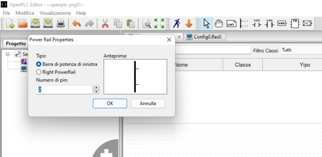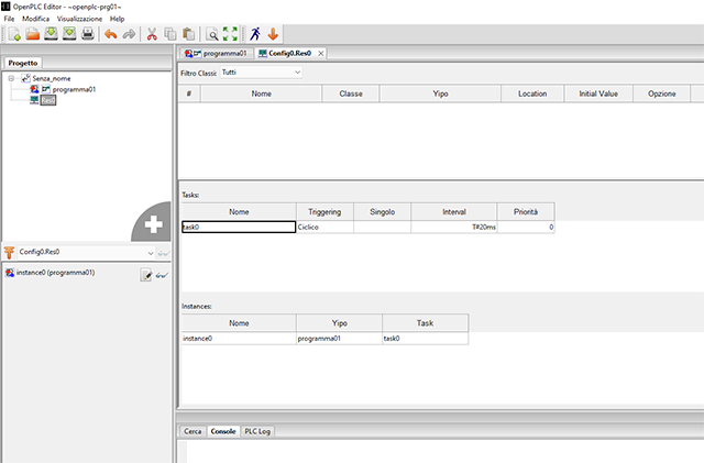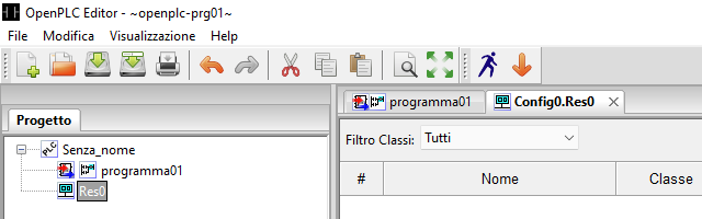Quando create un nuovo programma, l’editor OpenPLC crea automaticamente: configurazione, risorse attività e istanze, tutti questi elementi indicheranno a OpenPLC cosa farà il vostro programma. Per modificare i singoli elementi fate doppio clic su Res0 nel pannello di sinistra.