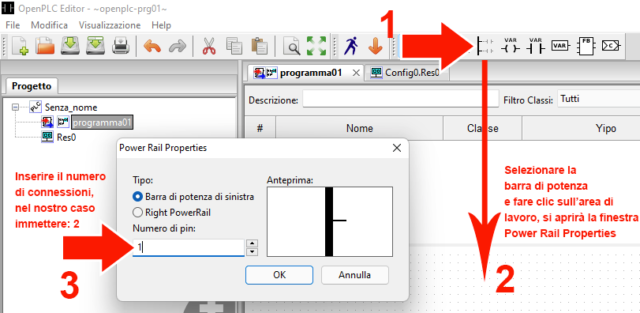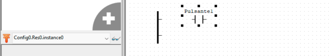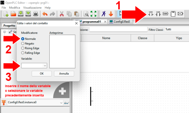 Nella finestra che compare, sotto il parametro “Variabile”, seleziona Pulsante1 per associare il nuovo contatto alla variabile Pulsante1. Il contatto verrà inserito nell’area di lavoro.
