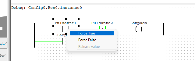 È possibile forzare l’attivazione o la disattivazione di un contatto o di una bobina facendo clic con il pulsante destro del mouse su di esso e selezionando Force True o Force False. Provate a forzare Pulsante1 su True (vero) e osservate il percorso del flusso di corrente verso la bobina Lampada. Quindi forzare Pulsante1 di nuovo su false e verificare che Lampada sia ancora attivato a causa del circuito di latch (autoritenuta).