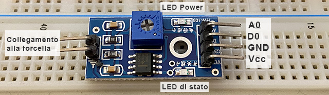 La forcella viene connessa ad un modulo elettronico e quest’ultimo dovrà poi essere connesso ad Arduino. Il modulo fornirà una tensione di uscita proporzionale alla resistenza rilevata dalla sonda, questa tensione verrà resa disponibile ad un pin analogico di Arduino, nell’esempio che segue collegheremo la sonda al pin A0.
