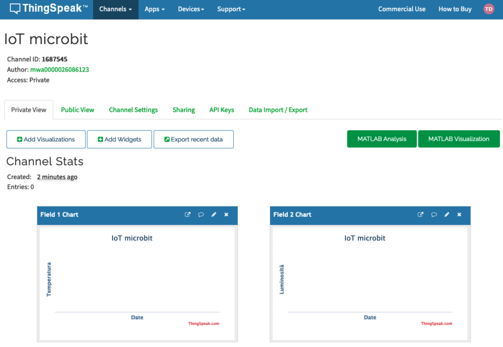 Per poter connettere il micro:bit, o altro microcontrollore è necessario creare un nuovo canale associato al dispositivo, clic su “New Channel”