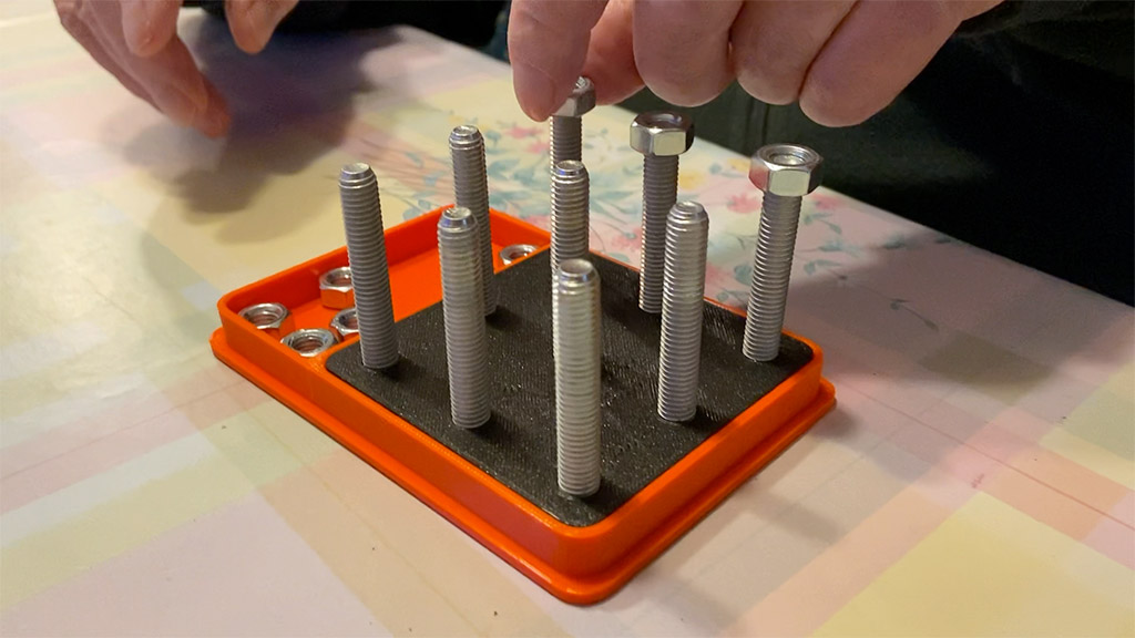 L’oggetto è composto da due elementi il primo ospita 9 viti M8 vincolate mediante una sede esagonale in cui inserire la testa della vite. La placca con le 9 viti si inserisce ad incastro in una base su cui ho predisposto anche un contenitore per i dadi.