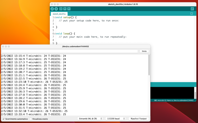 - la temperatura rilevata dal sensore di temperatura del micro:bit e la temperatura rilevata dal sensore disposto sull’RTC DS3231.