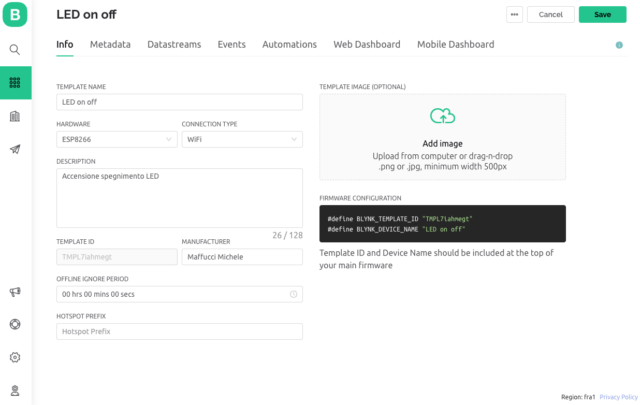 • NAME: il nome del da assegnare al template, nel mio caso LED on off