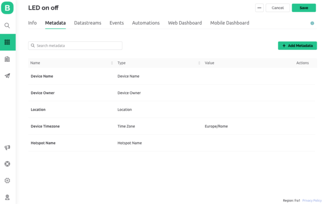 I metadata non sono altro che informazioni aggiuntive che possiamo aggiungere al nostro progetto: nome del dispositio, del proprietario del progetto, luogo in cui è allocato il dispositivo ed altro. Sono tutte informazioni che servono per rendere l’identità del dispositivo univoca e ben identificabile, quindi analizzando i metadati possiamo capire qual è l’obiettivo del progetto. Inoltre i metadata possono essere gestiti dall’utente, estratti e pubblicati se serve su pagina web.