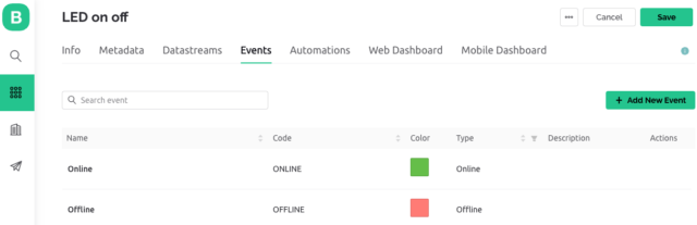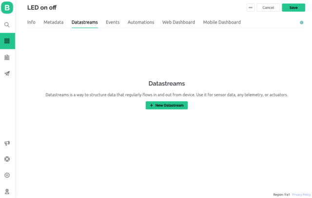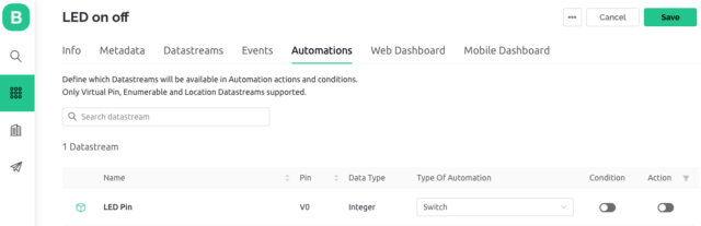 In questa sezione vengono definiti quali flussi di dati (datastream) saranno disponibili nelle azioni e nelle condizioni della vostra automazione. Possono essere gestiti solamente pin virtuali, enumerabili e posizione. sostanzialmente la nuova versione di Blink consente di progettare online un’automazione in funzione di condizioni/azioni su specifici pin, anche in questo caso si tratta di qualcosa di molto avanzato che verrà analizzato in seguito.
