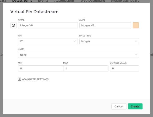 I pin digitali sono solamente remoti (impostazione solo su blynk.cloud). Per aggiungere i pin virtuali bisogna creare un datastream, vedremo poi impostare l’app sui pin virtuali.