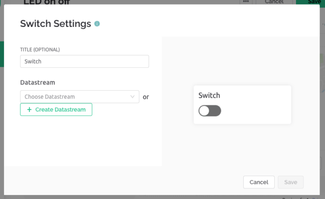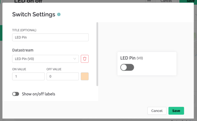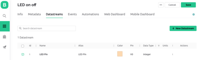 • Selezionate il Datastream ed associare il datastream creato, nel mio caso: LED Pin (V0) che trovate facendo clic sul menù a tendina