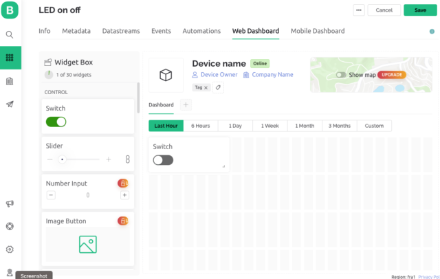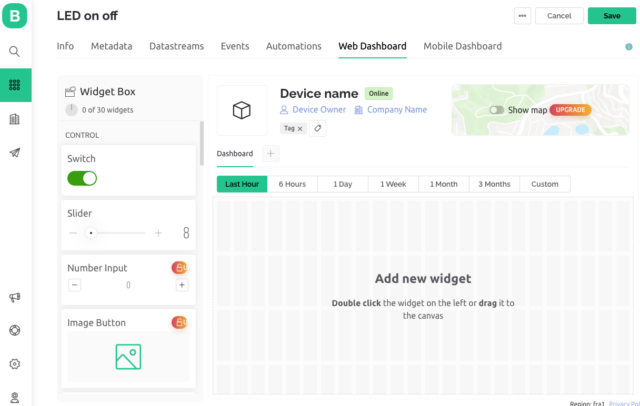 La Web Dashboard può essere assimilata al luogo in cui creiamo e gestiamo ogni Widget che fa parte della console di gestione e controllo dell’App IoT.