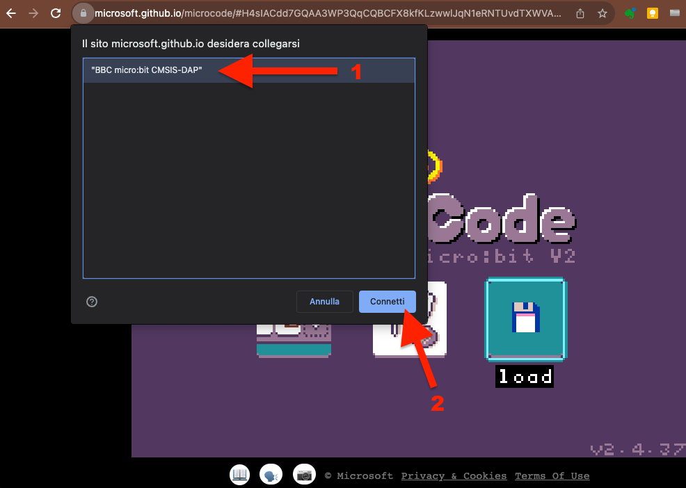 - Selezionare “BBC micro:bit CMSIS-DAP” e premere su “Connetti” nella finestra di dialogo.