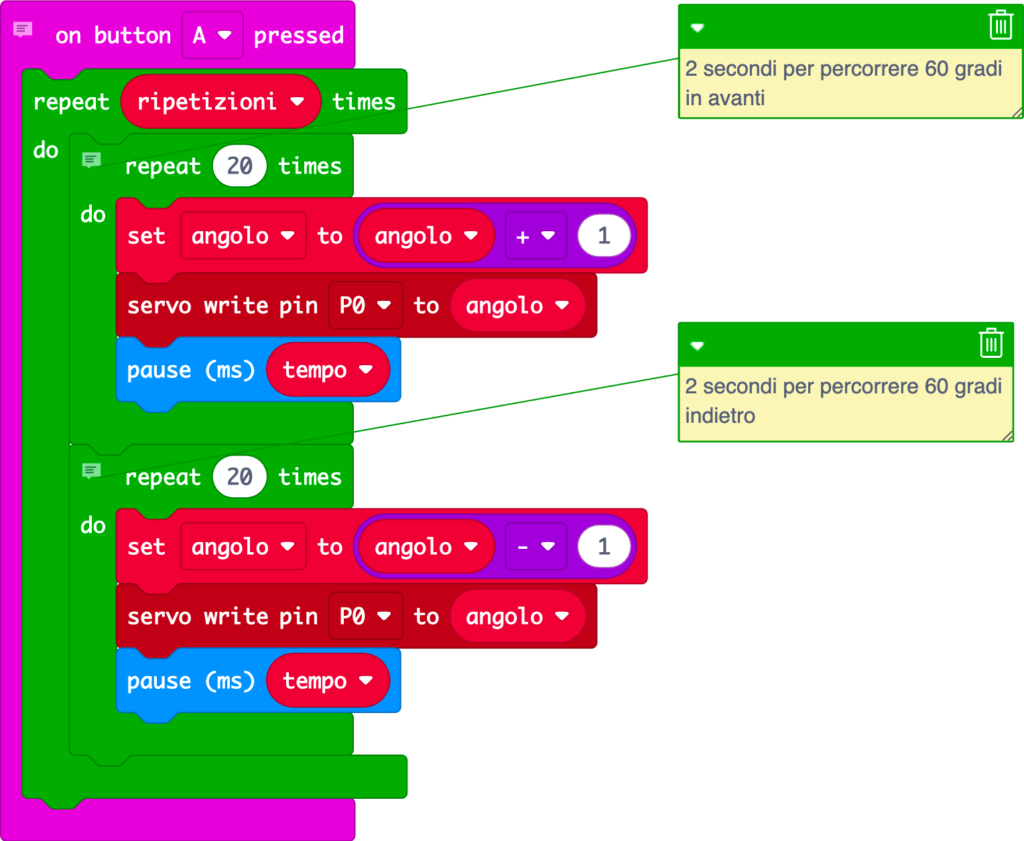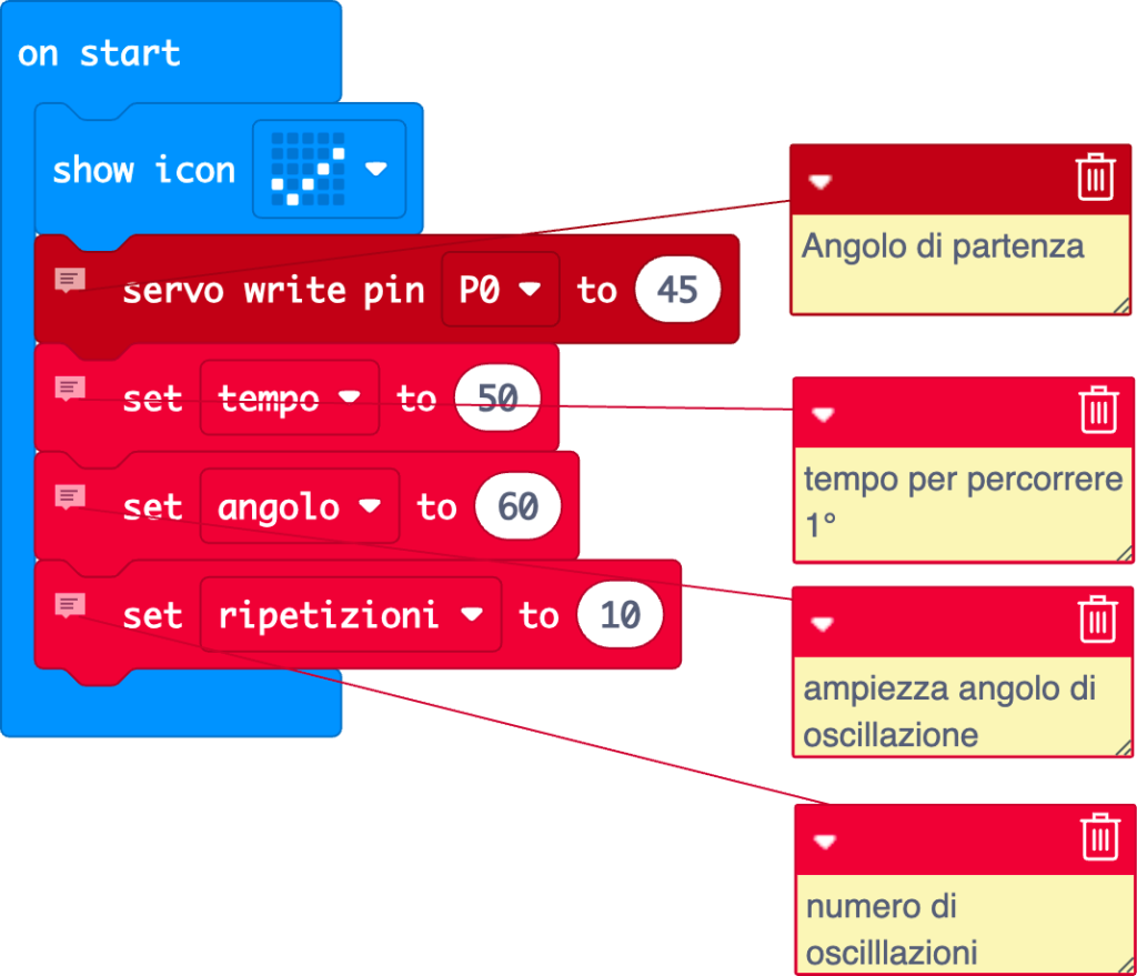setconsentono di impostare le tre variabili: tempo: variabile che definisce il numero di millisecondi necessari per spostare di 1° l’asse di rotazione del servomotoreangolo: angolo di oscillazioneripetizioni: numero di oscillazione, se fissato a 10 il tempo totale di oscillazione è circa 20 secondi, se fissato a 30 il tempo totale di oscillazione è circa 1 minuto
