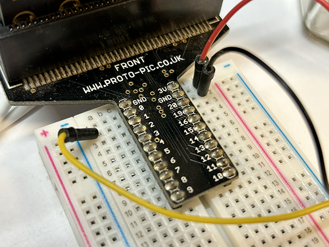 Il servomotore, come sapete è cotituito da tre pin, due di alimentazione, nella foto di colore nero e rosso ed uno di controllo, nella foto identificato dal colore giallo. Connettere il filo giallo al pin 0 del micro:bit, il nero al GND ed il rosso a 3V.